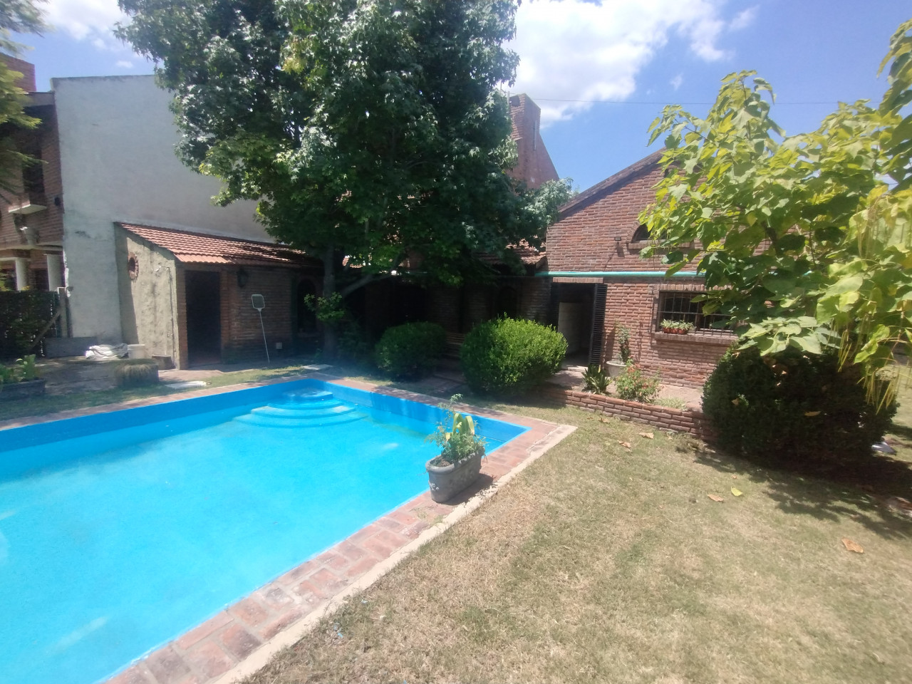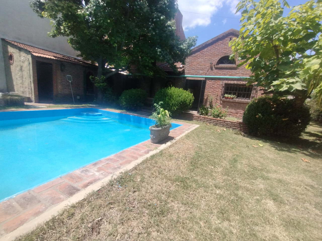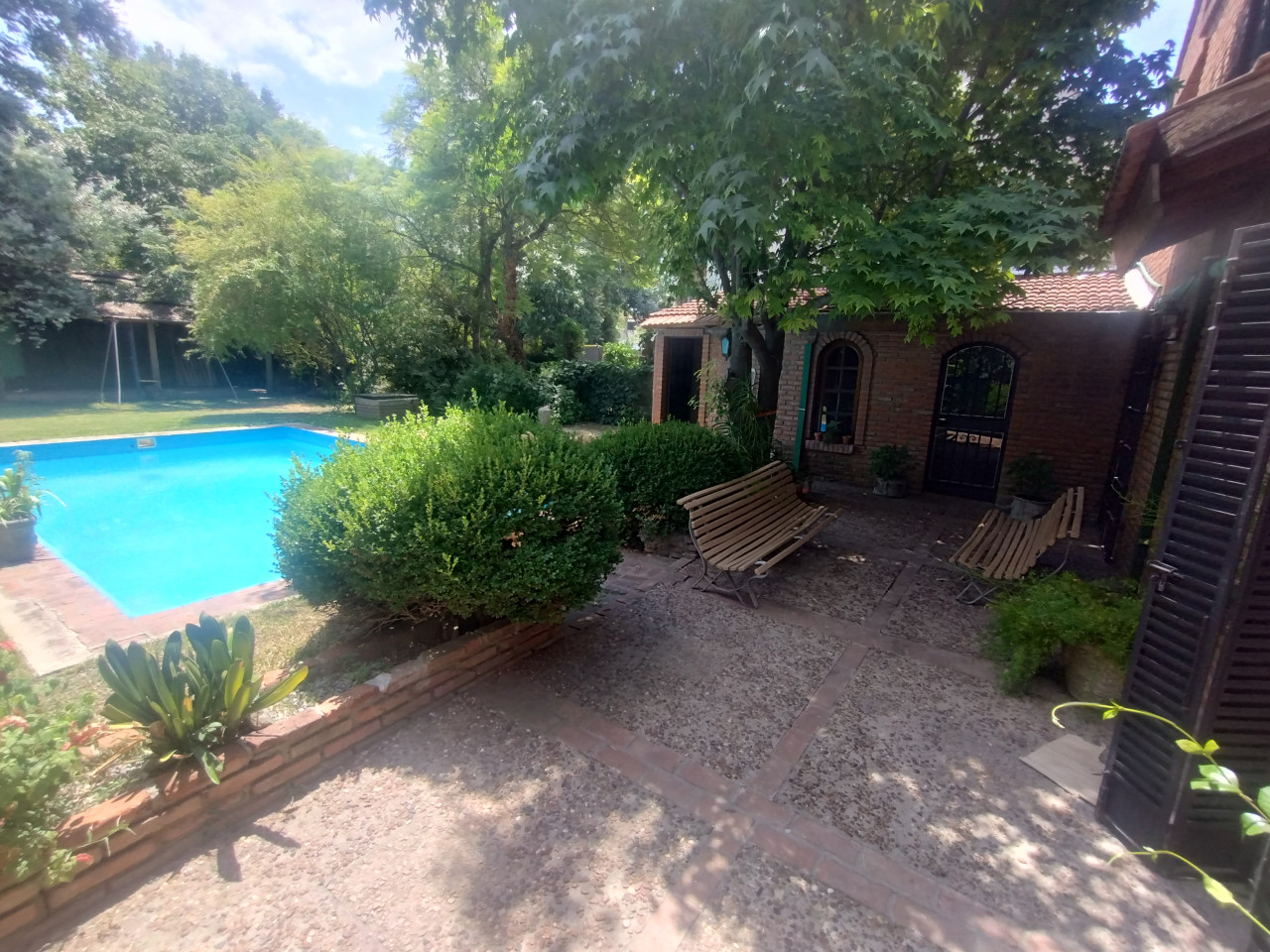 Gran jardín con galería semicubierta.