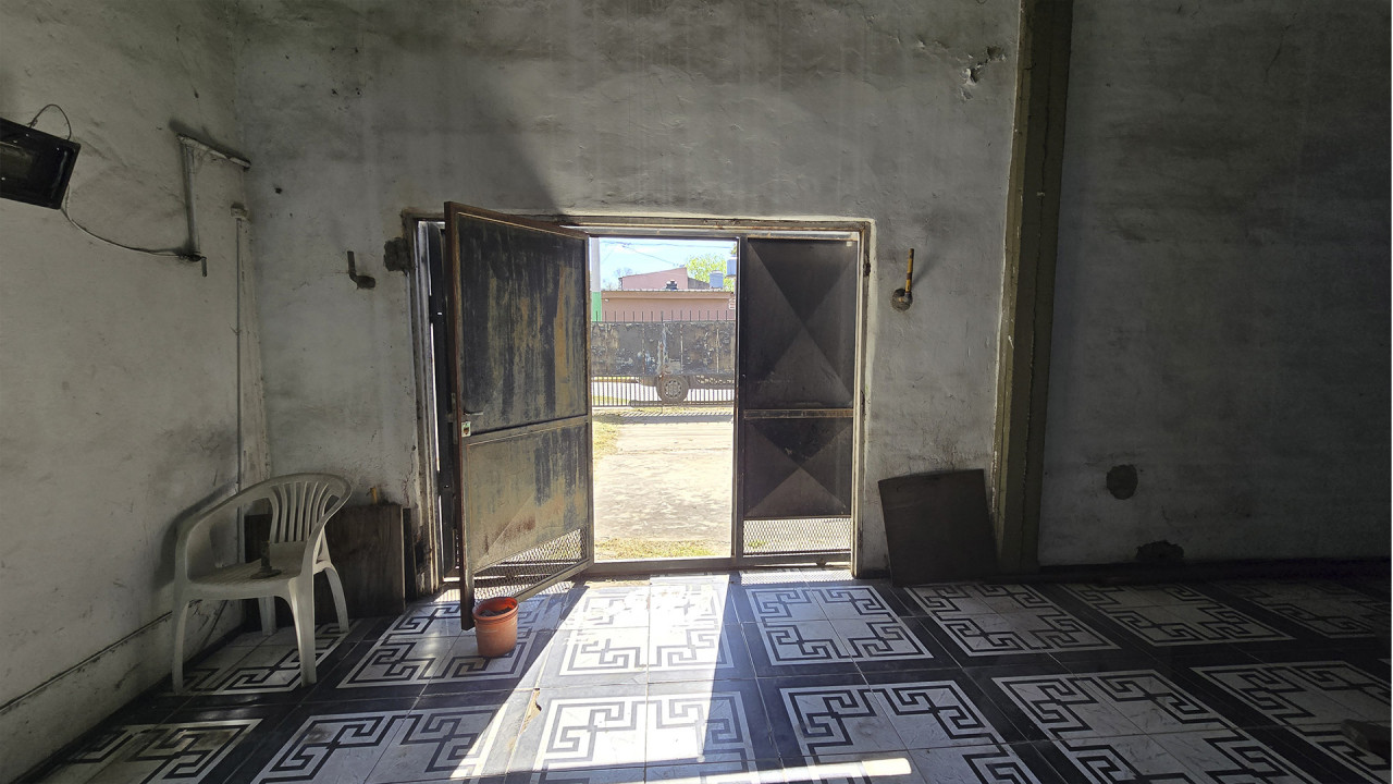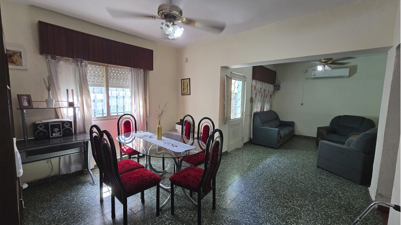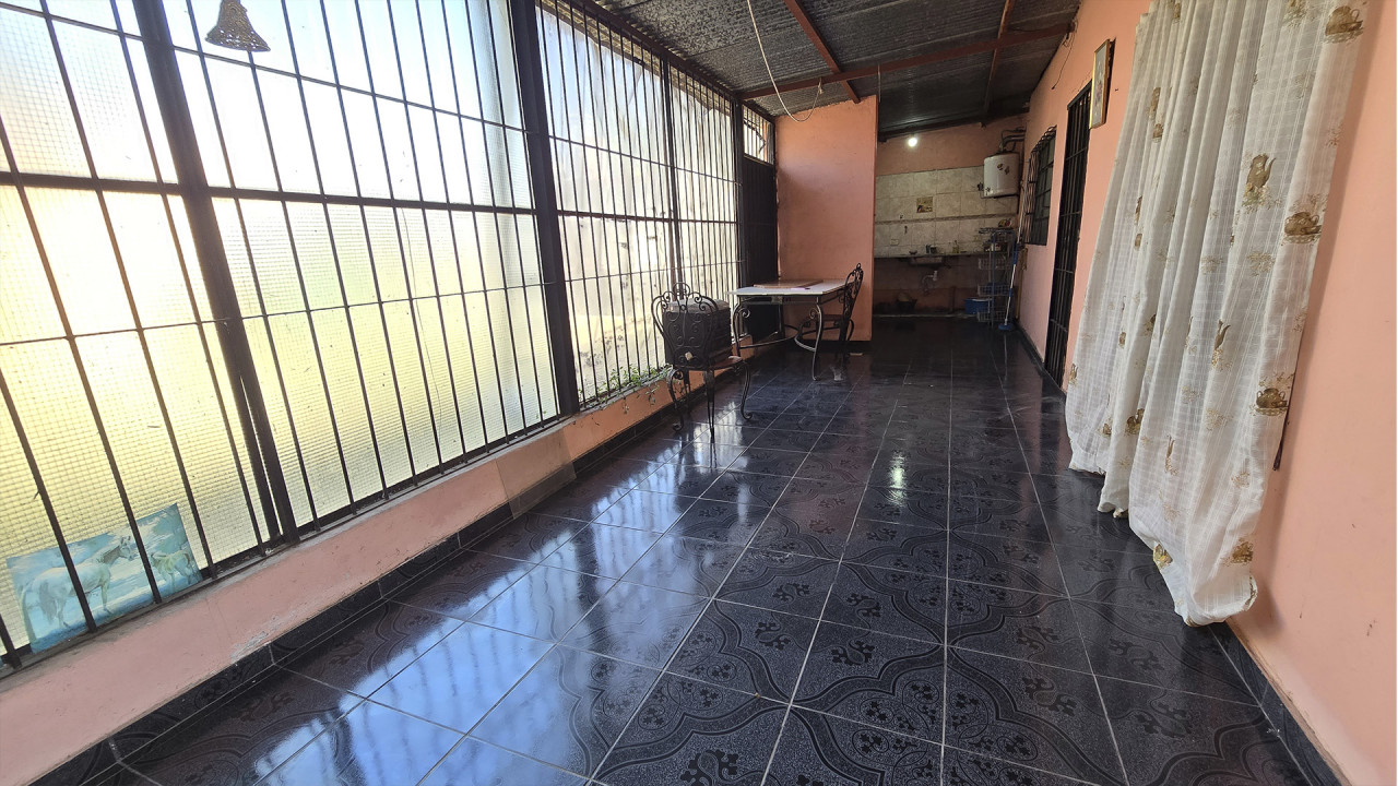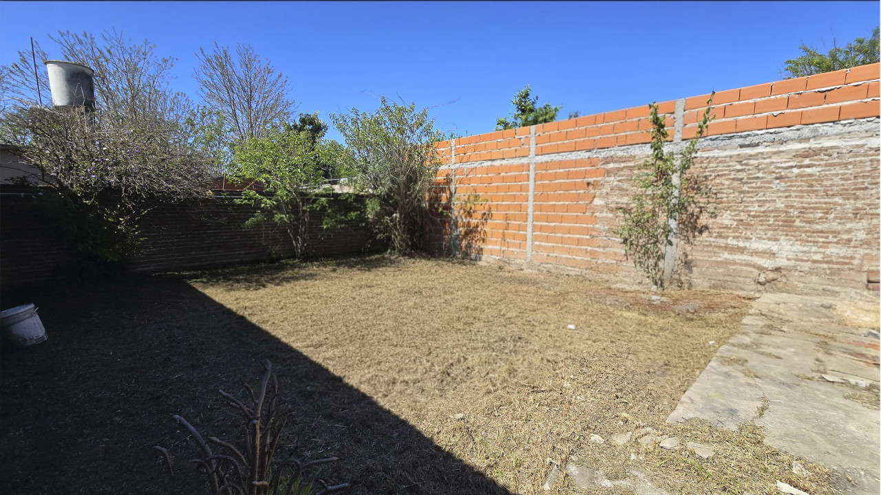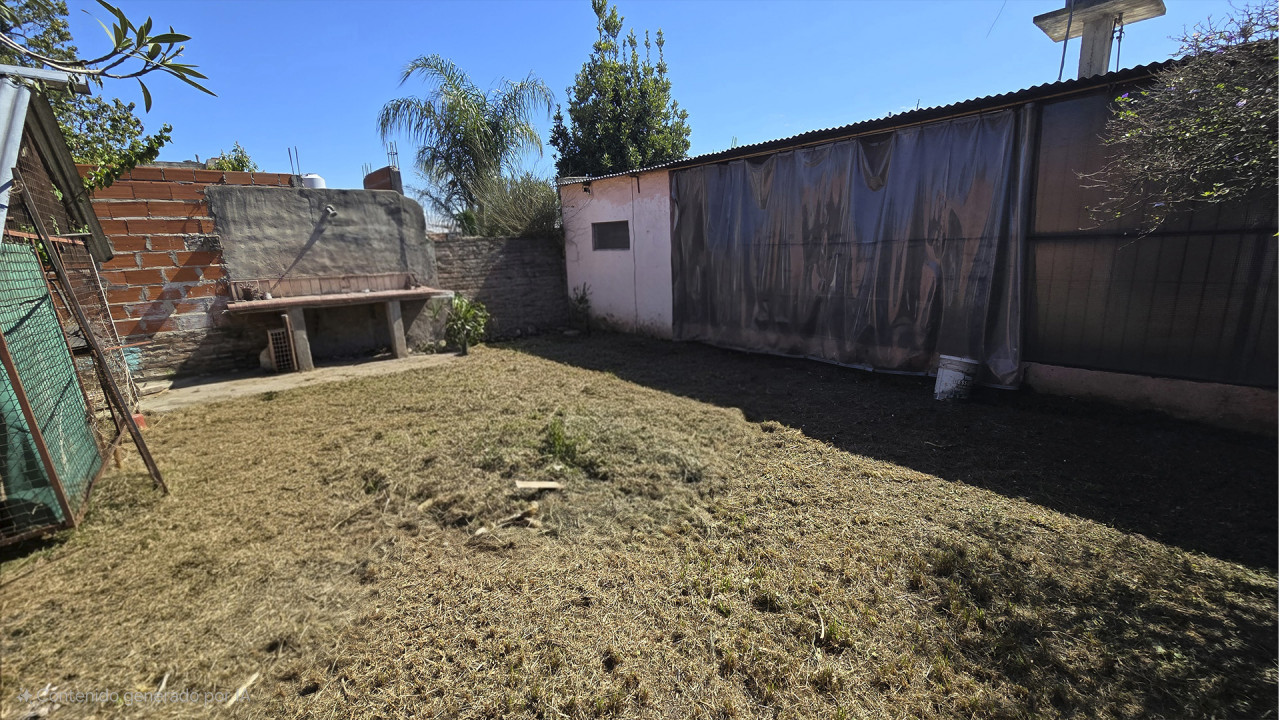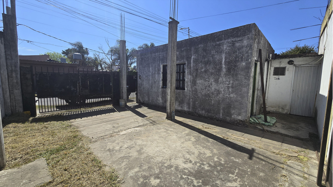 La casa ubicada al fondo, de aproximadamente 8 m x 12 m, cuenta con living (3,5 m x 4 m), comedor (4 m x 4 m), cocina comedor diario en “L” (4 m x 4 m), pasillo distribuidor, baño (2 m x 2,5 m), dormitorio principal (3 m x 4 m) y segundo dormitorio (2,5 m x 3 m). Además, posee una galería posterior de 2,7 m x 10 m con acceso al patio trasero, techada con chapa, y un amplio patio descubierto.