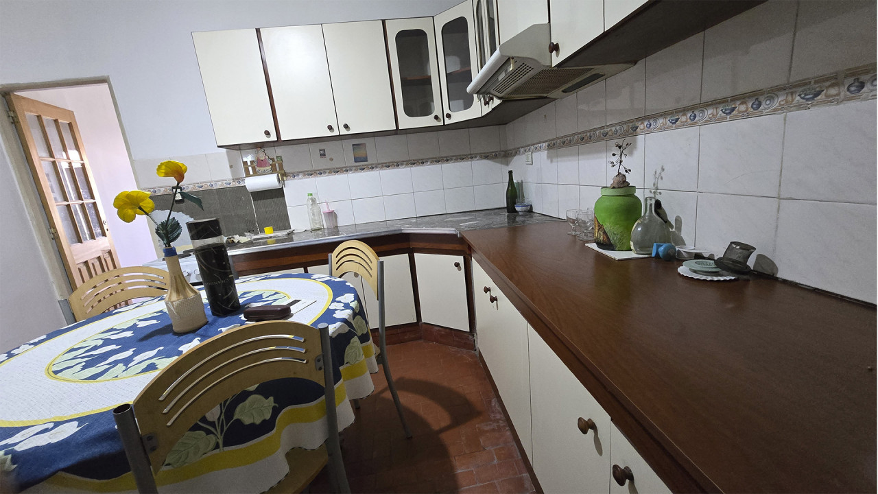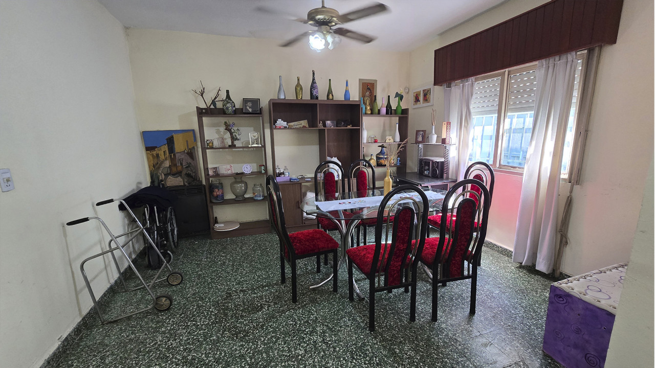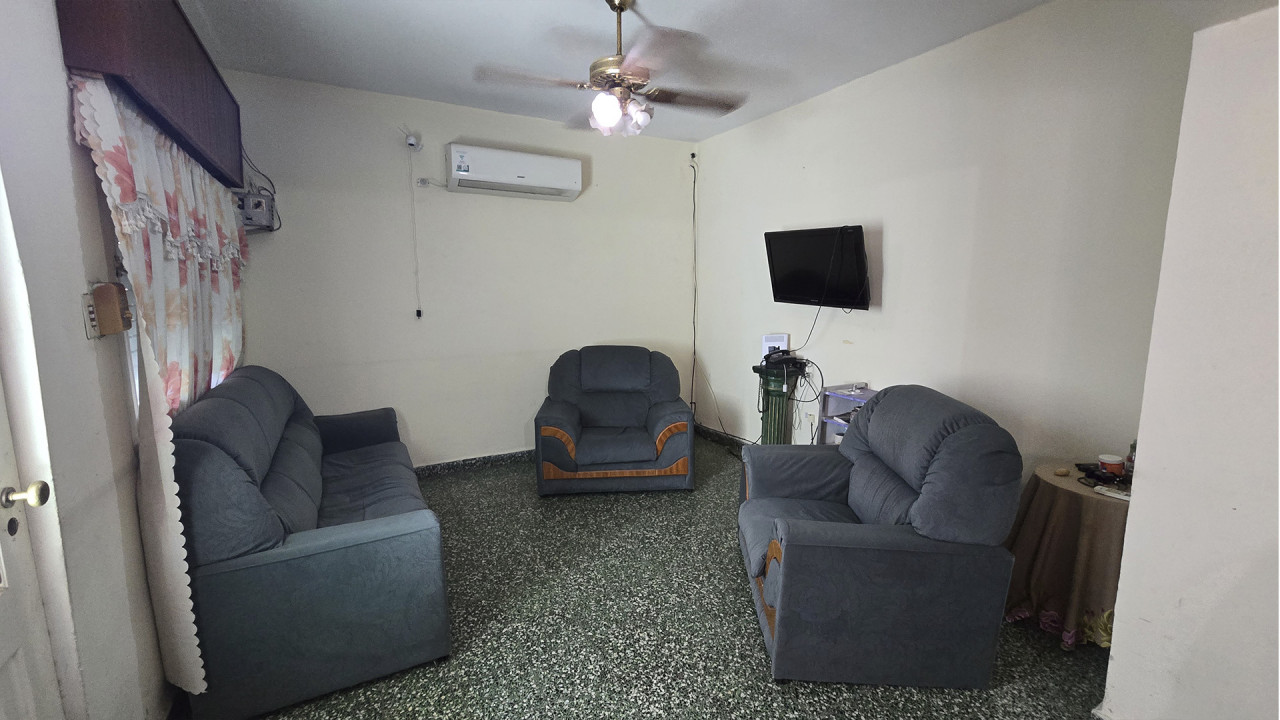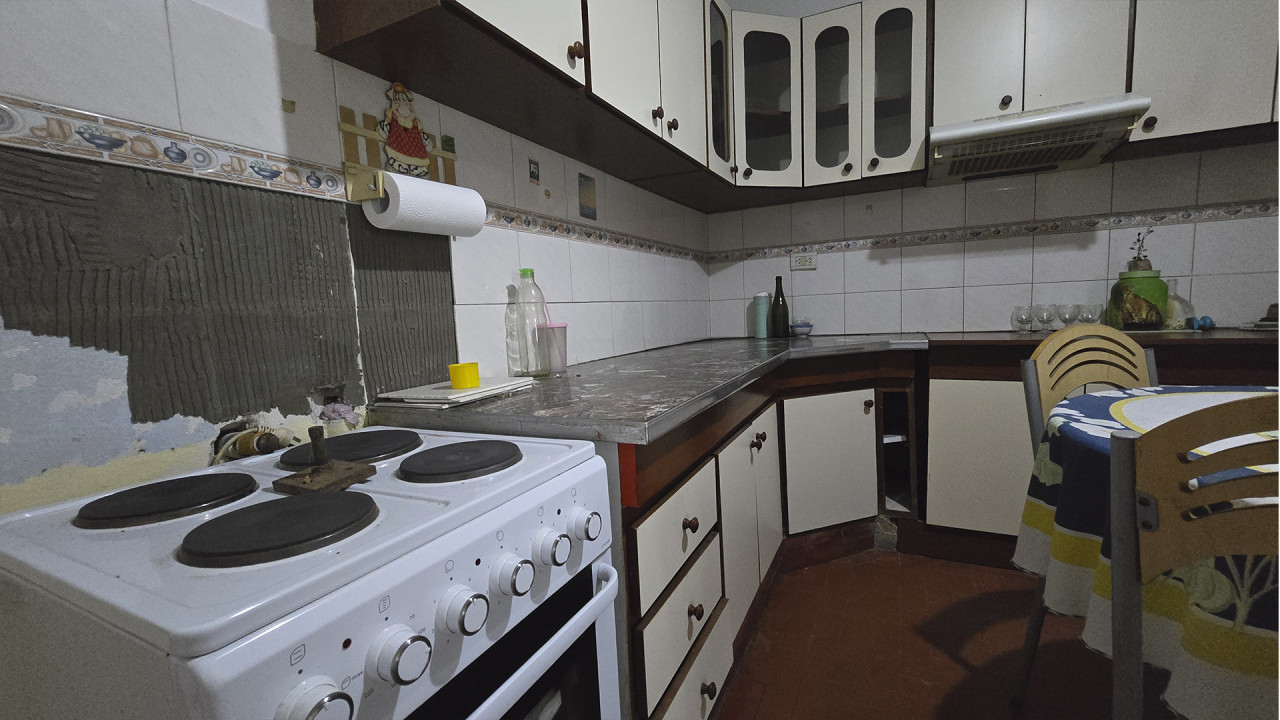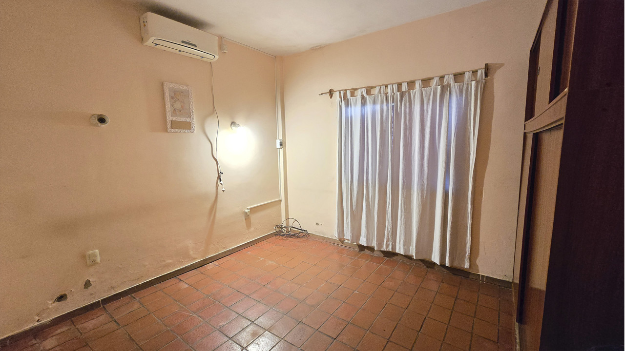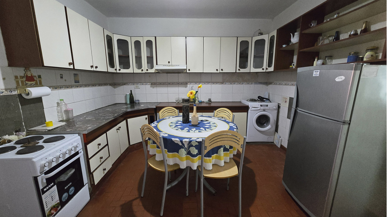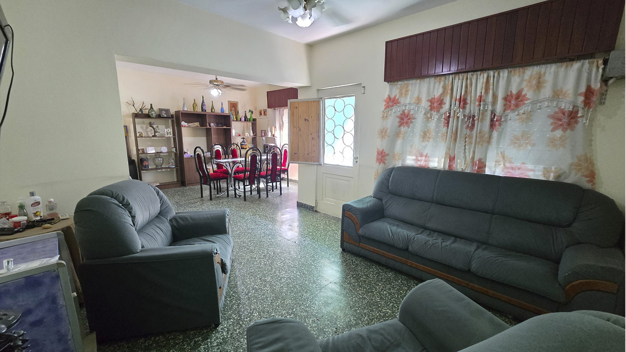 La casa ubicada al fondo, de aproximadamente 8 m x 12 m, cuenta con living (3,5 m x 4 m), comedor (4 m x 4 m), cocina comedor diario en “L” (4 m x 4 m), pasillo distribuidor, baño (2 m x 2,5 m), dormitorio principal (3 m x 4 m) y segundo dormitorio (2,5 m x 3 m). Además, posee una galería posterior de 2,7 m x 10 m con acceso al patio trasero, techada con chapa, y un amplio patio descubierto.